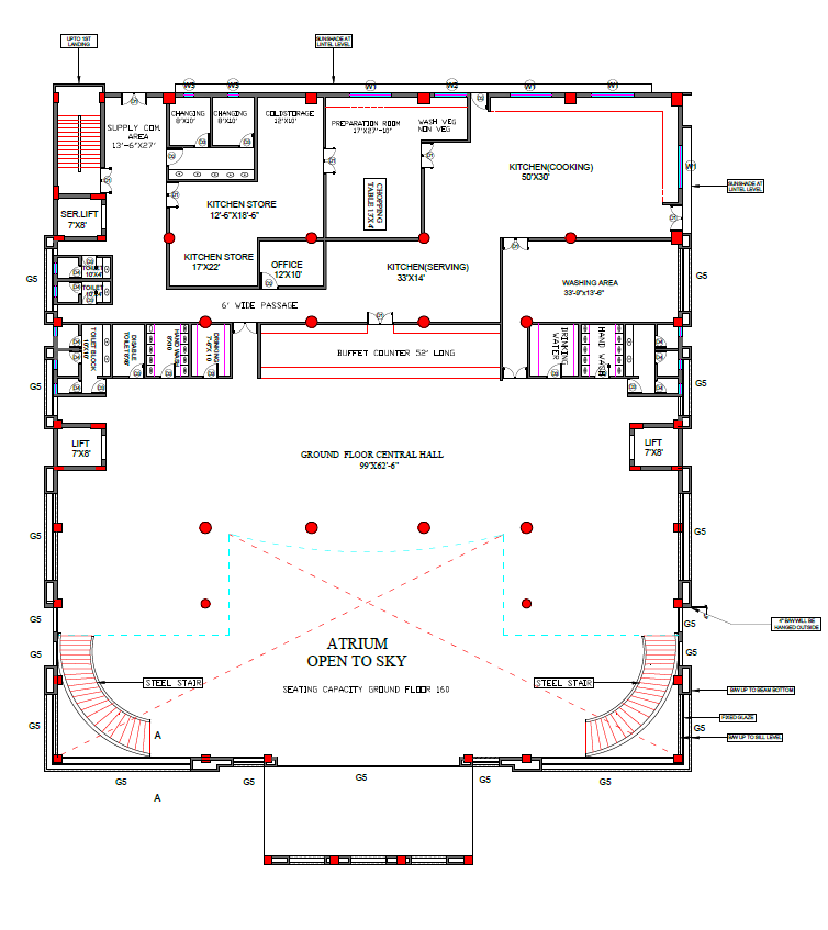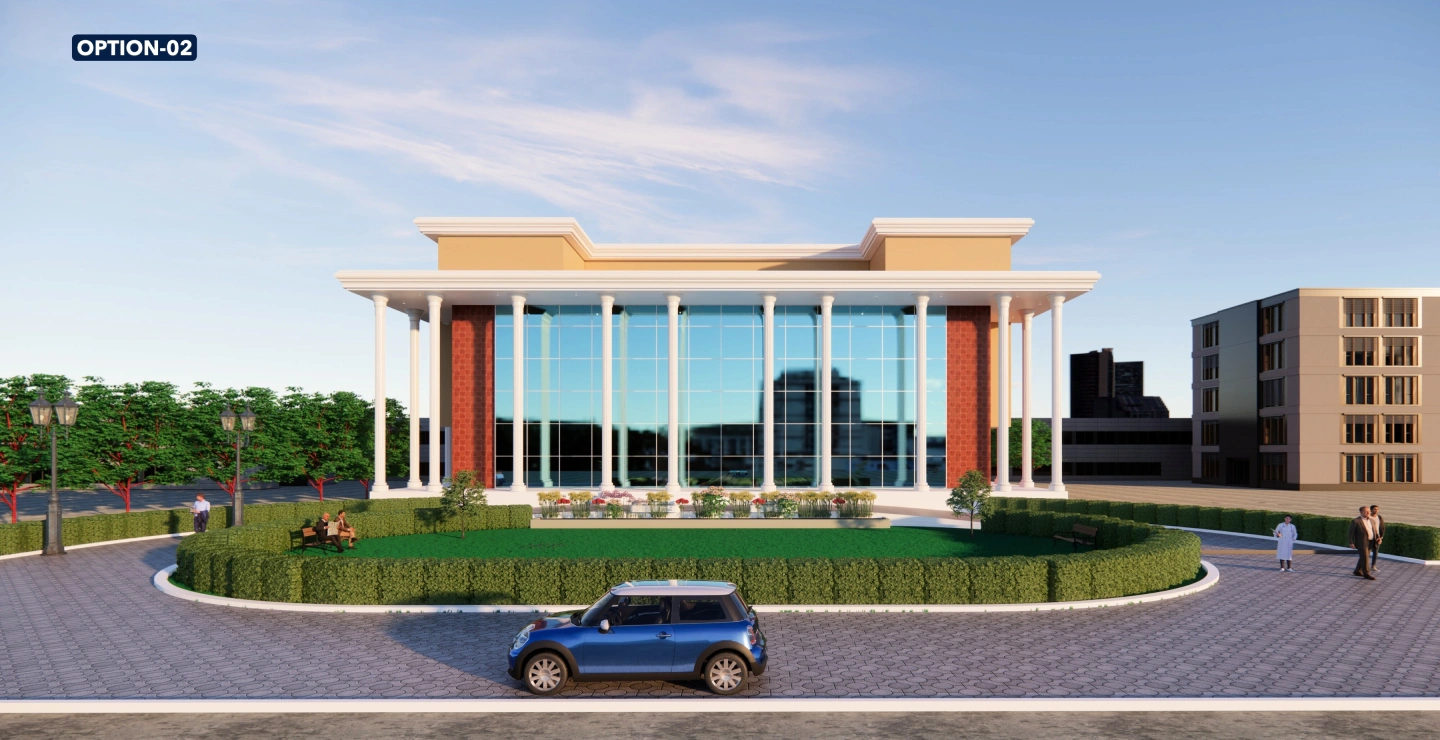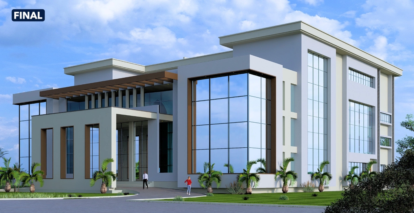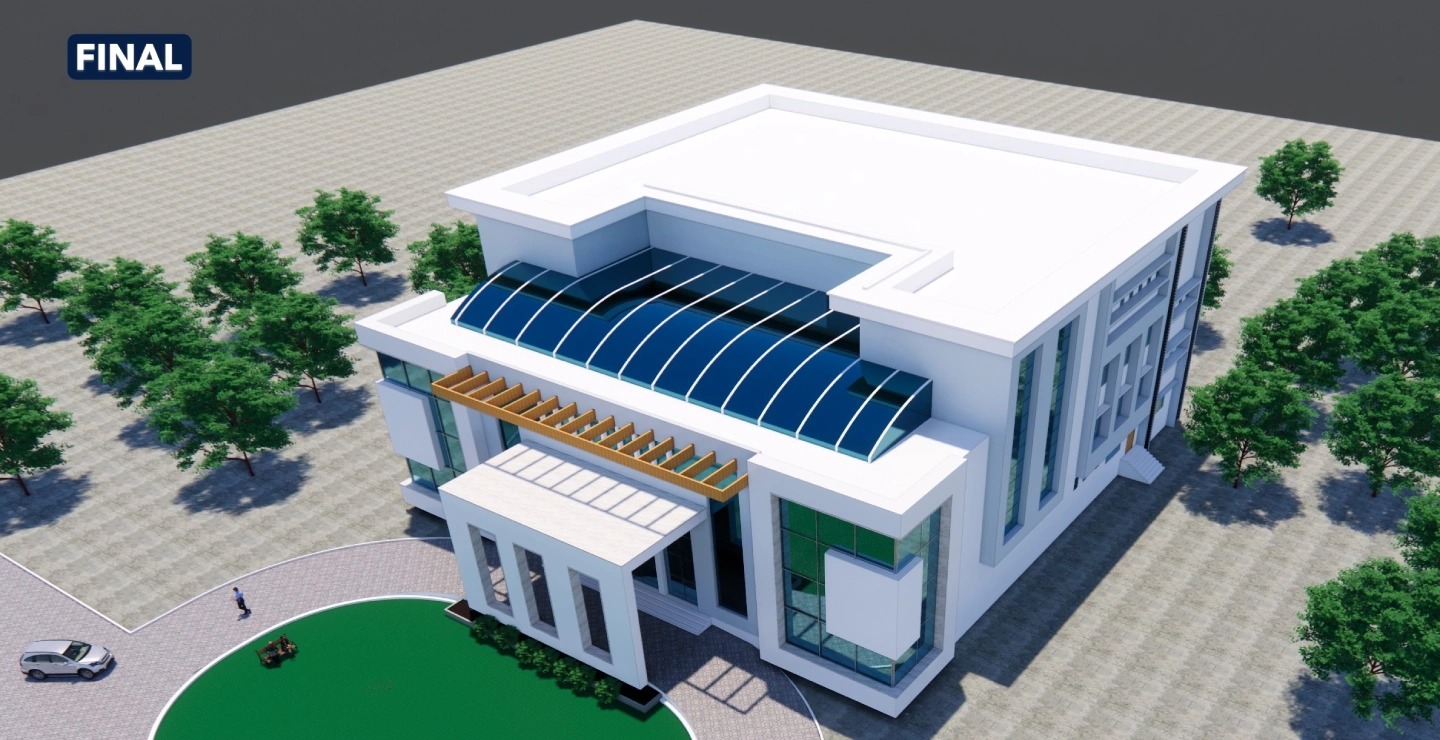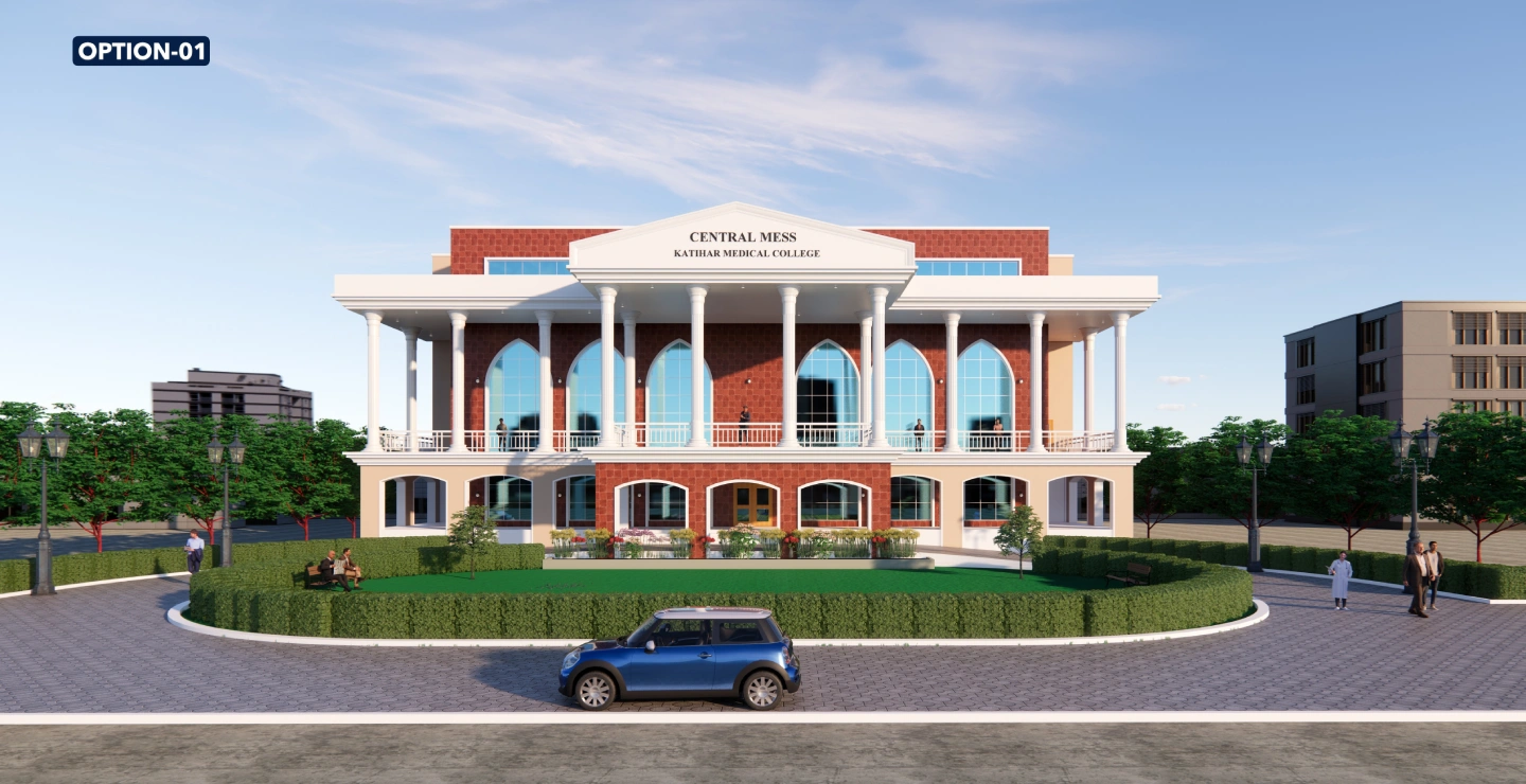 Katihar Medical College Mess is a completed G+3 dining facility that blends modern architecture with highly functional planning. The building is defined by its clean geometric façade, expansive glazing, and a welcoming entrance canopy that elevates the overall campus experience. A signature feature of the design is the central open-to-sky atrium, which fills the interiors with natural light and enhances the sense of space within the 160-seat dining hall. The entire facility is planned for smooth operations, with clearly zoned preparation areas, cooking spaces, washing sections, storage rooms, and a dedicated service lift supporting vertical movement. One of the most notable engineering achievements in this project is the longest clear span of 42 feet, provided to create a large column-free dining hall. This structural solution not only resolved the functional requirements but also added to the building’s grandness and openness, giving the space an impressive visual scale. The completed project delivers a balance of aesthetic clarity, operational efficiency, and structural innovation, making it a strong reference for clients seeking high-quality design solutions for any scale of residential, commercial, or institutional work.