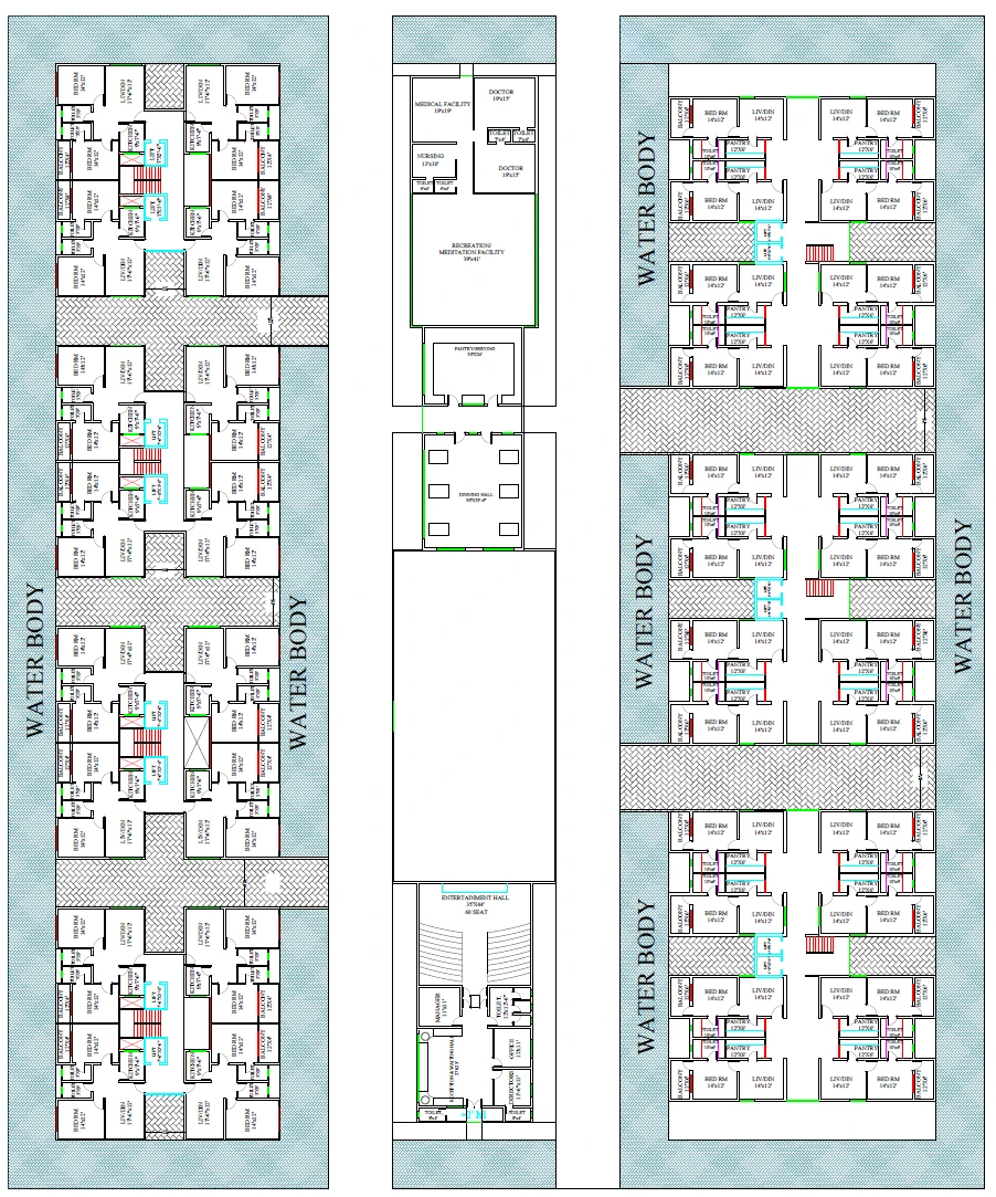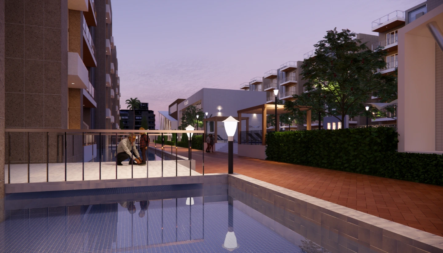 A defining element of this development is the extensive waterbody corridor that runs along both sides of the residential blocks, creating a calm, cooling environment while enhancing visual appeal for all units. Wide landscaped walkways, shaded promenades, and seating pockets throughout the campus support slow, comfortable movement ideal for elderly residents.