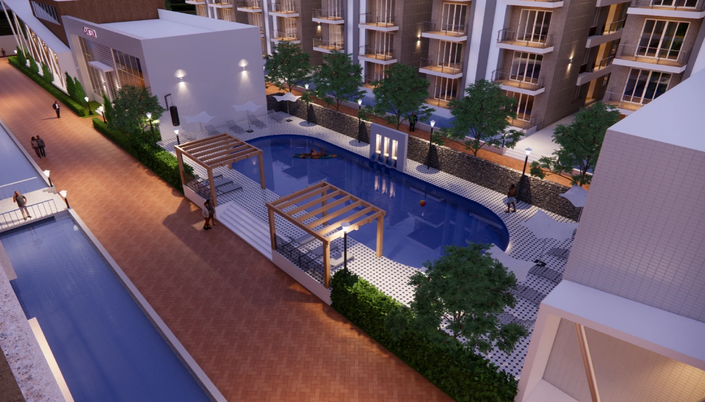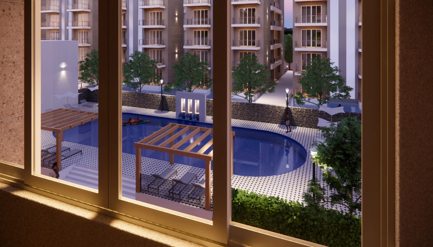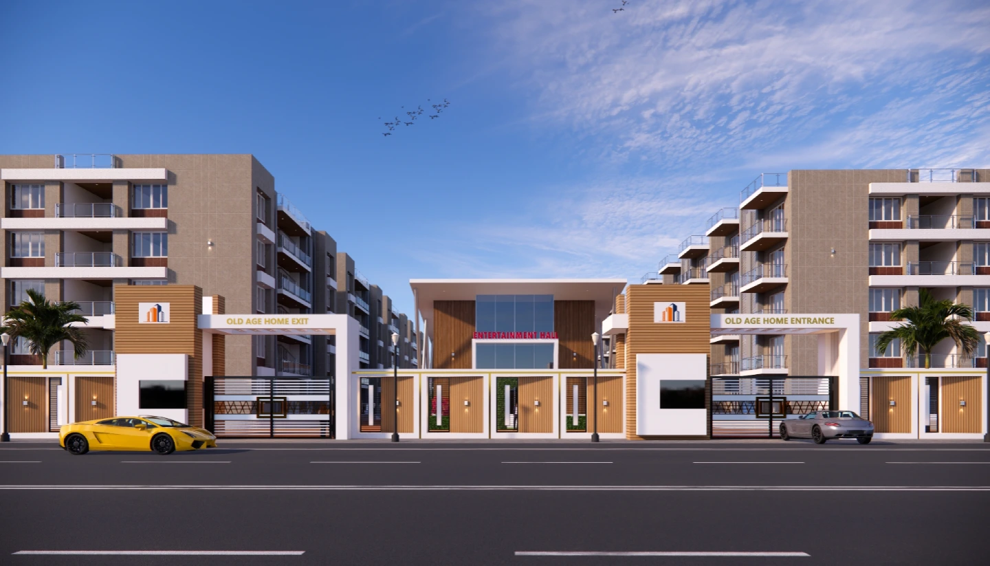 Architecturally, the towers follow a contemporary elevation language with warm textures, glass railings, and deep balconies that bring natural light and fresh air into the living spaces. All pathways are designed with anti-skid surfaces, handrails, and barrier-free mobility, prioritizing safety and comfort for senior citizens.
