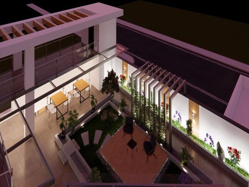 The rooftop garden offers a peaceful escape from the clinical environment. With its landscaped green pockets, wooden deck, curated seating, vertical green screens, and soft lighting, the space promotes relaxation, mindfulness, and emotional ease. This elevated courtyard is complemented by a compact yet effective fitness deck, providing users with a dedicated wellness space. Together, they represent the hospital’s commitment to holistic healing by blending nature, recreation, and health.